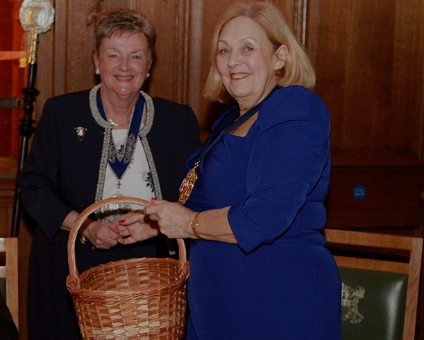 Prime Warden, Anne Holden presenting a rush handbag to Alderman, Alison Gowman.